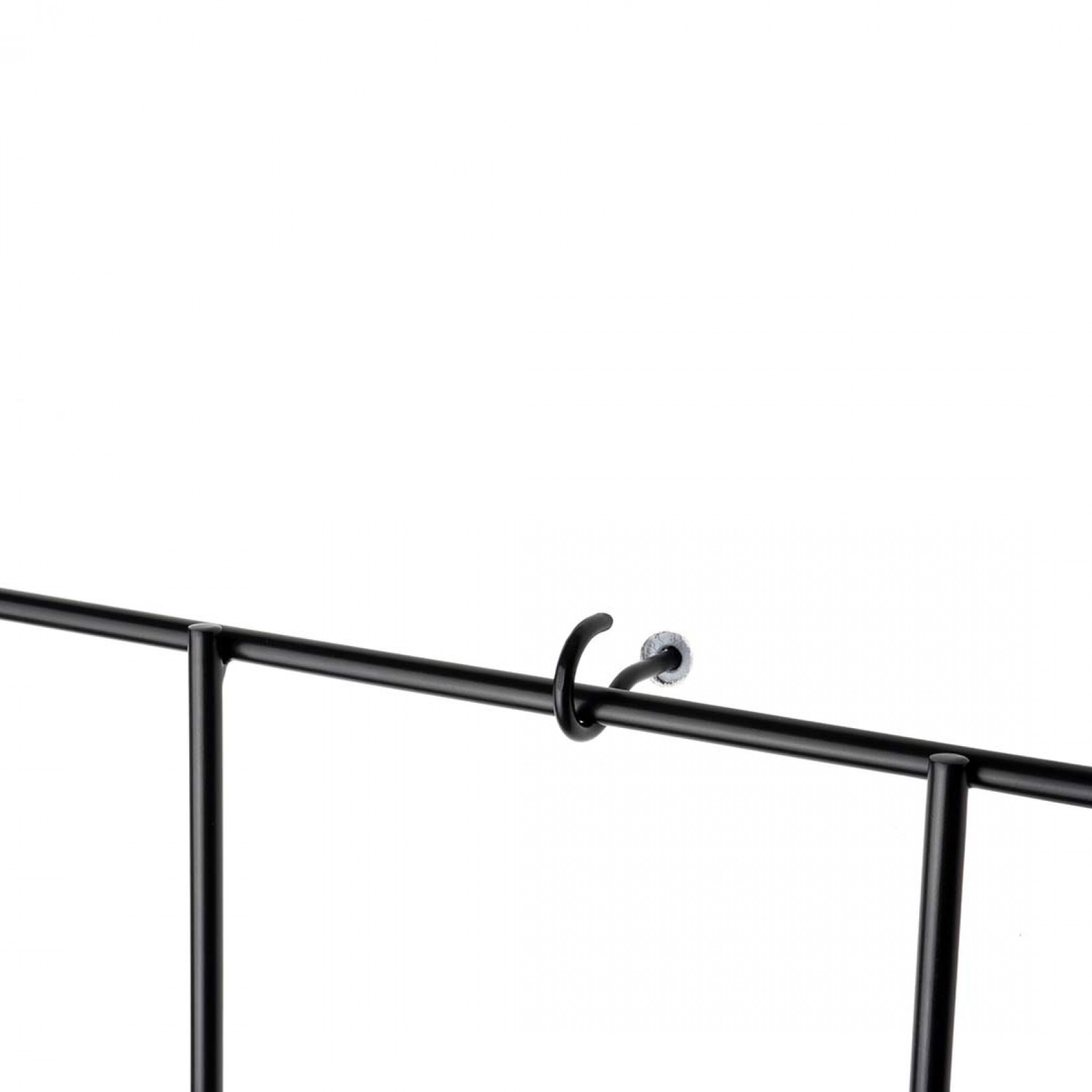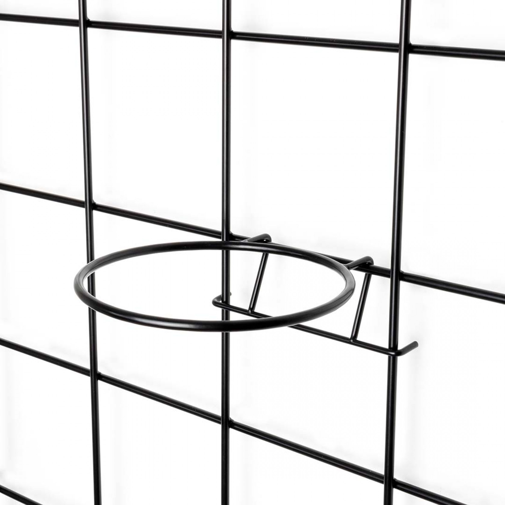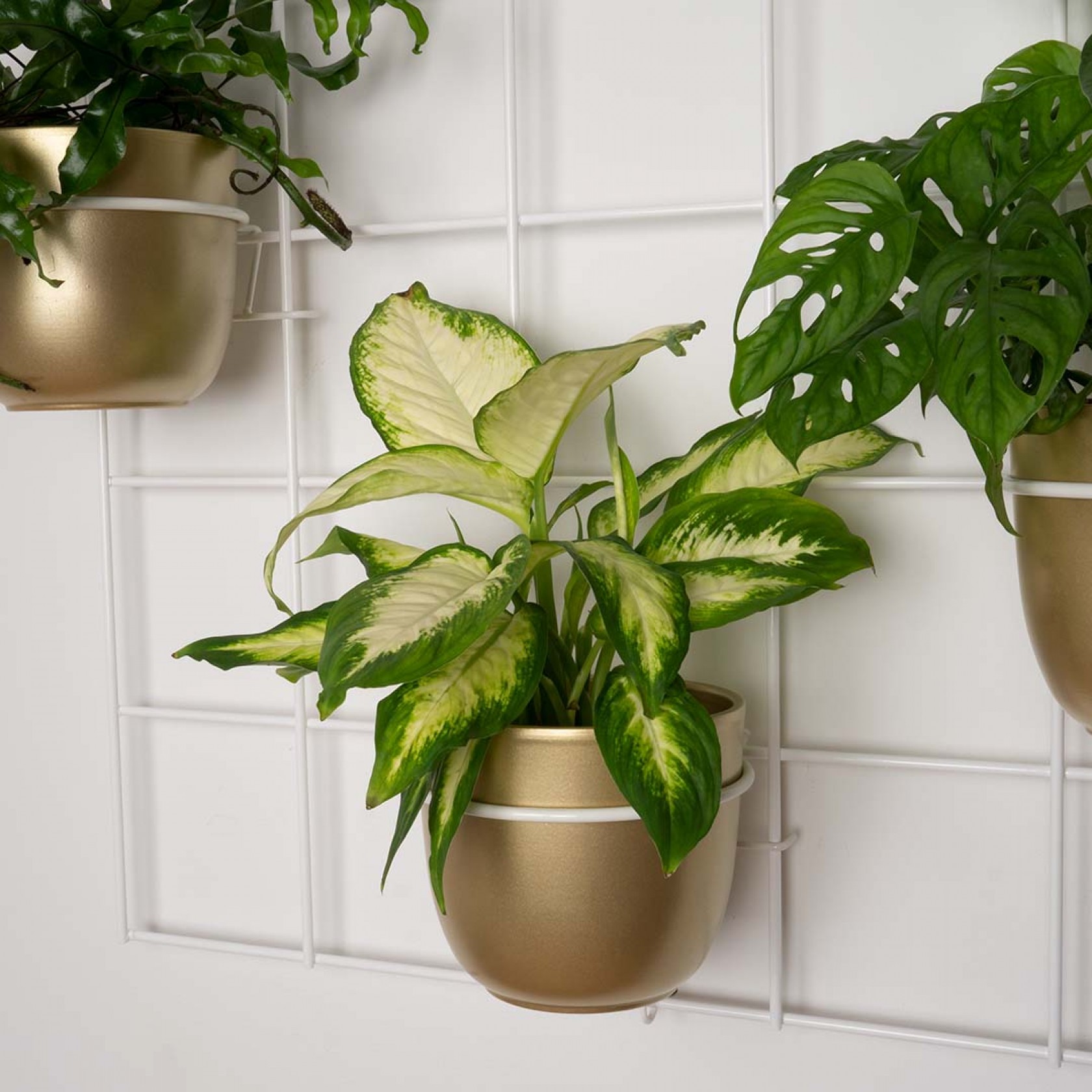 Dzięki uchwytom montażowym element jest oddalony od ściany (krata wisi na hakach) co sprawia, że kwietnik zyskuje bardziej przestrzenny charakter.